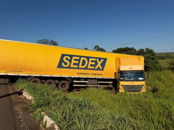 Caminhão dos Correios perde o controle e para em área de vegetação na BR-267 em Bataguassu