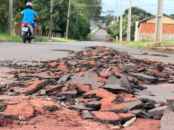 Chuva forte causa destruição, arranca asfalto e carrega carro em Nova Andradina