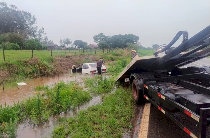 Carro sofre aquaplanagem e sai da pista na MS-141, em Ivinhema