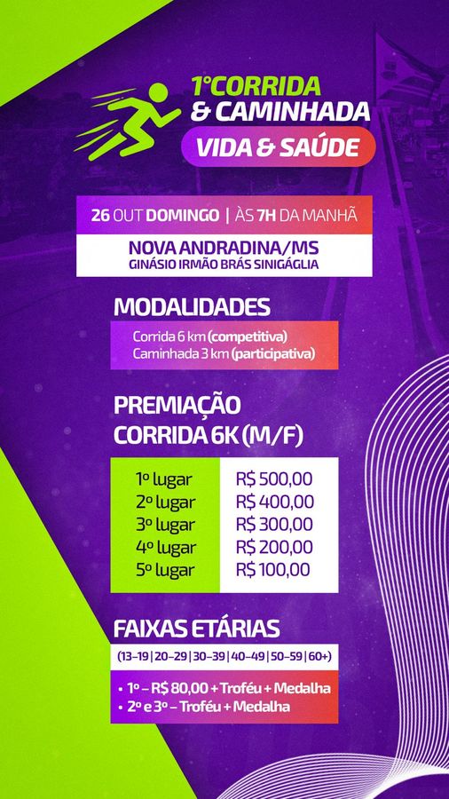 Prepare o tênis e aqueça o corpo! A cidade se prepara para receber a 1ª Corrida e Caminhada Vida e Saúde no dia 26 de outubro de 2025. O evento promete movimentar atletas e entusiastas de todas as idades, combinando esporte, saúde e muita diversão.