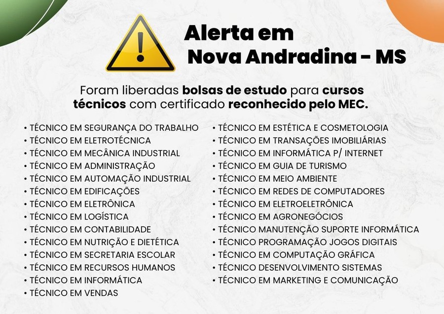 Estão abertas inscrições para bolsas de estudos em cursos técnicos para pessoas residentes em Nova Andradina, através de formação qualificada e autorizada pelo Ministério da Educação (MEC).