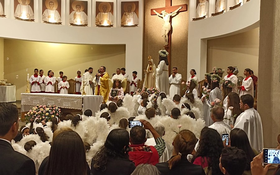 Com o Santuário lotado, parte dos fiéis se acomodou do lado de fora do templo, onde uma estrutura com telão, equipamento de som e cadeiras foi montada para que todos pudessem acompanhar a celebração.