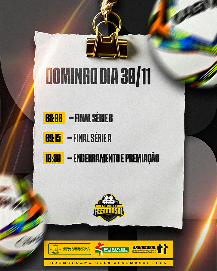 O domingo (30) será reservado às decisões máximas. Às 8h, será realizada a final da Série B; e às 9h15, o duelo mais aguardado do fim de semana: a grande final da Série A, que pode coroar Nova Andradina como campeã pela primeira vez. A cerimônia oficial de encerramento e premiação está marcada para às 10h30, reunindo autoridades municipais, estaduais e prefeitos das cidades finalistas para celebrar dois dias de competição intensa e de forte mobilização esportiva.