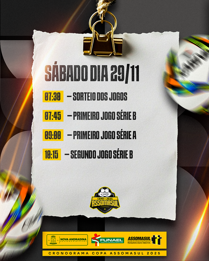 A programação começa no sábado (29), às 7h30, com o sorteio dos confrontos das semifinais e finais. A bola começa a rolar às 7h45, com a primeira partida da Série B. Às 9h, tem início o primeiro duelo da Série A, seguido pelo segundo jogo da Série B às 10h15, encerrando a manhã de disputas.