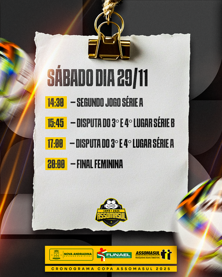 No período da tarde, a emoção continua. Às 14h30 acontece o segundo jogo da Série A; às 15h45, a disputa pelo 3º e 4º lugar da Série B; e às 17h, a definição do 3º e 4º lugar da Série A. À noite, às 20h, o duelo feminino entre Campo Grande e Caarapó promete encerrar o sábado em clima de grande decisão.