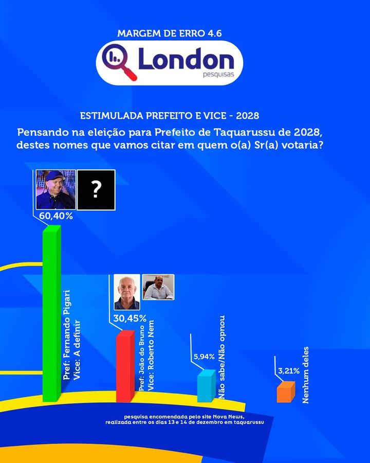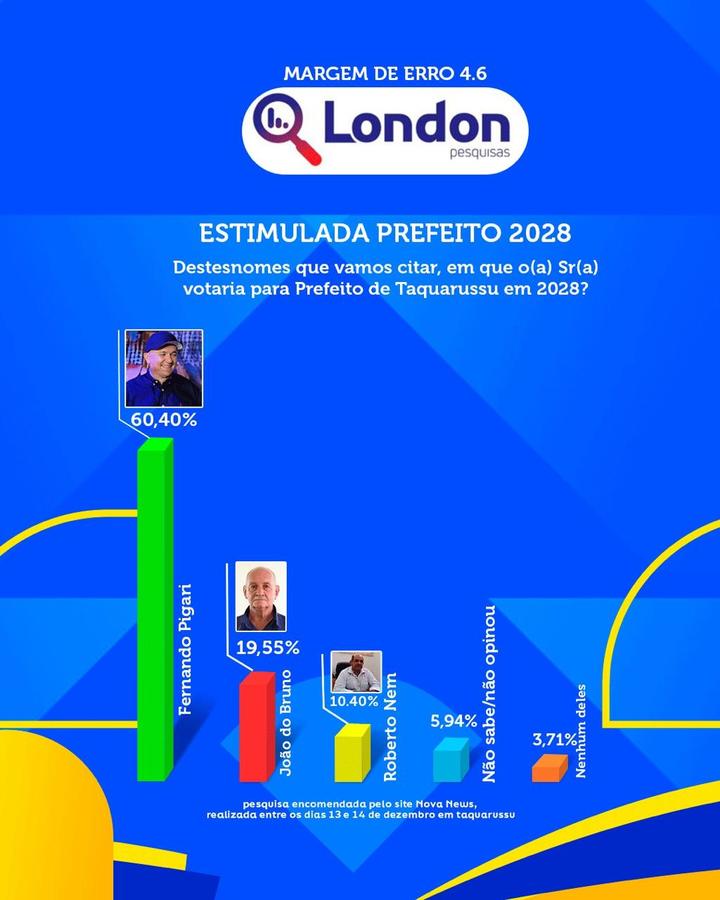 O desempenho de Fernando Pigari indica que sua atuação na gestão municipal já o coloca no centro do debate sucessório em Taquarussu. Ao mesmo tempo, o alto índice de indecisos mostra que o cenário ainda está aberto e pode sofrer mudanças até 2028.