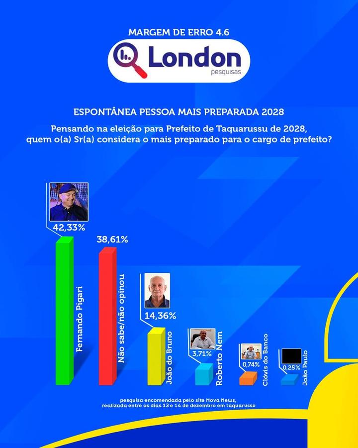 Pesquisa da London Pesquisas mostra que Fernando Pigari, secretário municipal, lidera com folga a pergunta espontânea sobre quem é considerado o nome mais preparado para assumir a Prefeitura. Ele aparece com 42,33% das citações, índice bem acima dos demais concorrentes.