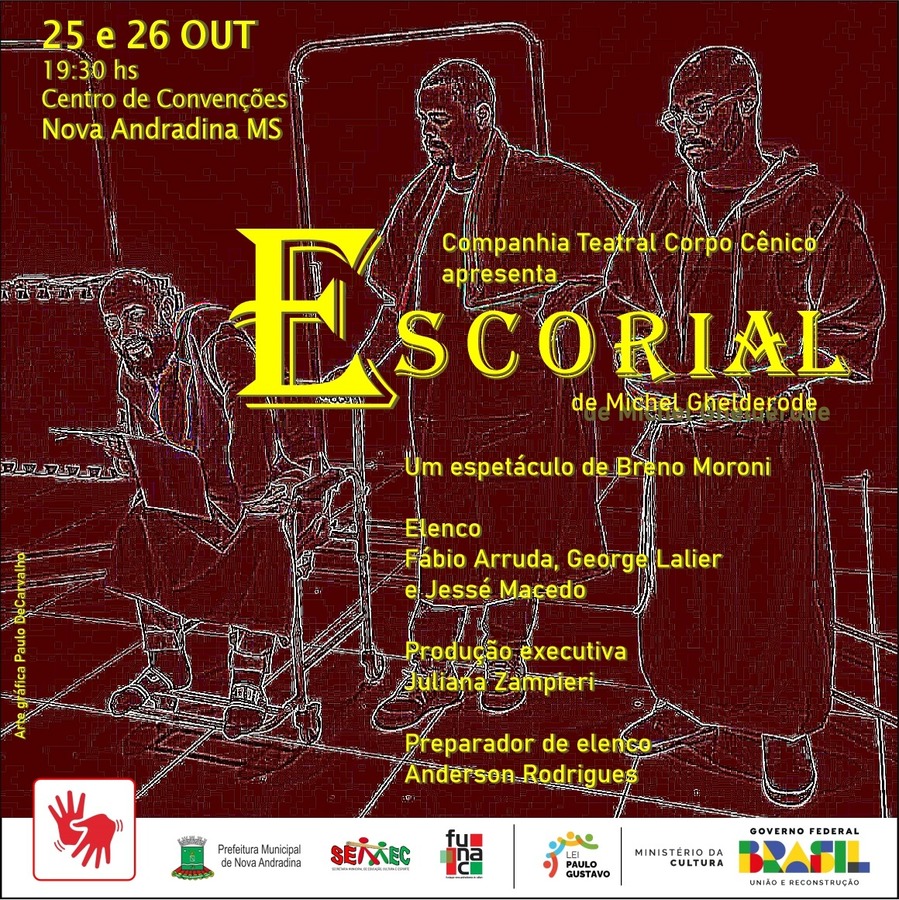 Nova Andradina recebe duas sessões do espetáculo teatral "O Escorial", na sexta-feira (25) e sábado (26), no centro de Convenções Silvio Ubaldino de Souza. A entrada é gratuita, com início às 19h30, em ambos os dias.