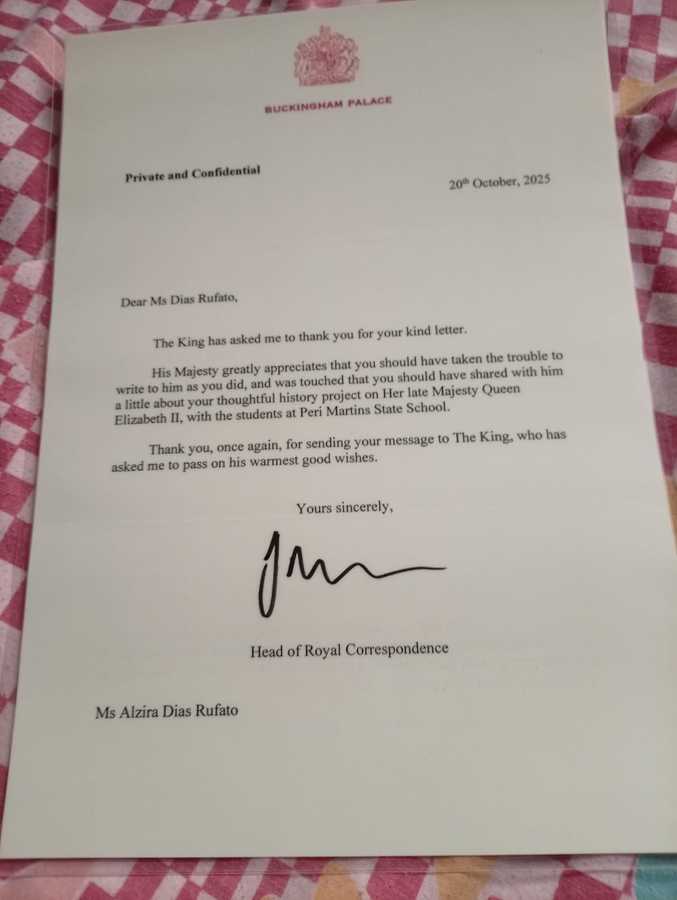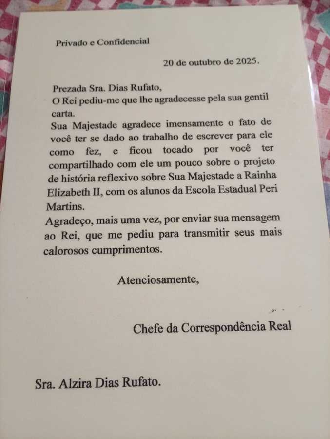 Neste ano, a professora enviou uma carta ao Rei Charles III e ao Príncipe William, na qual relembrou o projeto. A iniciativa recebeu resposta oficial encaminhada pela equipe da Casa Real Britânica.